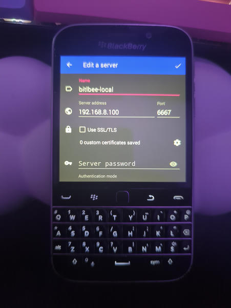Bitlbee works on your host the same as it does on a VPS. For demonstration, I will set it up on my localhost and then connect from my BlackBerry to my localhost to interact with Bitlbee. I also suggest doing the same to avoid the risk of leaking any information by accident and for security reasons. I will do a follow-up on how to self-host it on a cheap VPS or access it over a public instance in general.